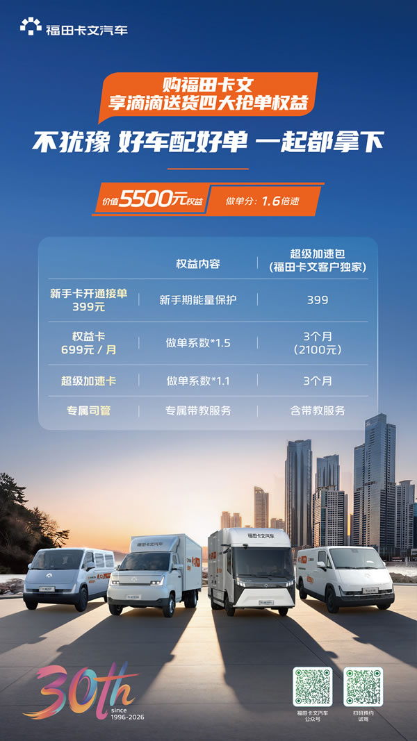 2026年4月,福田汽车旗下新能源商用车专属品牌福田卡文汽车,正式推出重磅购车权益:凡在官方授权门店购买卡文乐福、卡文乐迪、卡文乐途三大系列任意车型,提车即可免费申领总价值5500元的滴滴送货抢单权益套餐。这套方案跳出传统价格促销的局限,直击司机增收全链路痛点,以“产品+权益+服务”的组合拳,为从业者打通从上路到稳赚的完整路径,真正践行“让每一公里更美好”的品牌使命。